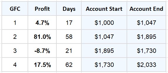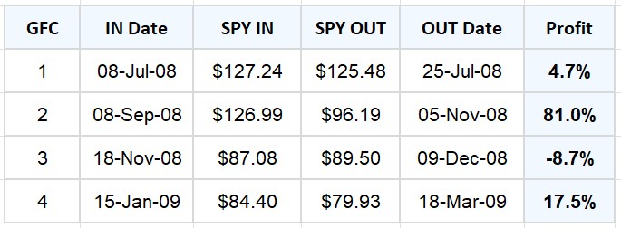The Global Financial Crisis was a period of severe market stress, marked by rapid declines and violent counter-trend rallies. This section shows the ITM trades generated during the GFC when qualifying conditions were met.