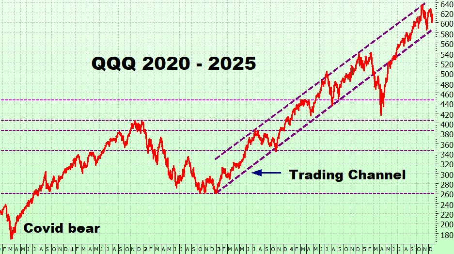 And on the long term chart, QQQ is slap bang in the middle of the trading channel.