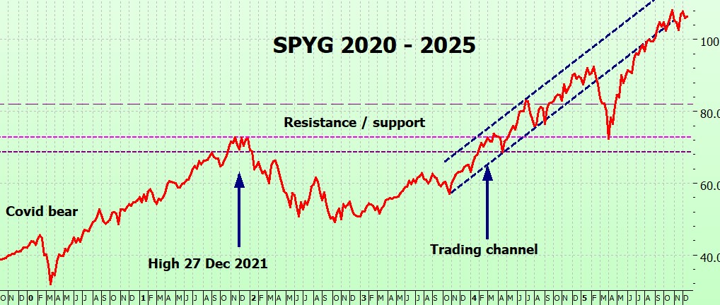 Longer term, SPYG is still hugging the lower bound of the channel.
