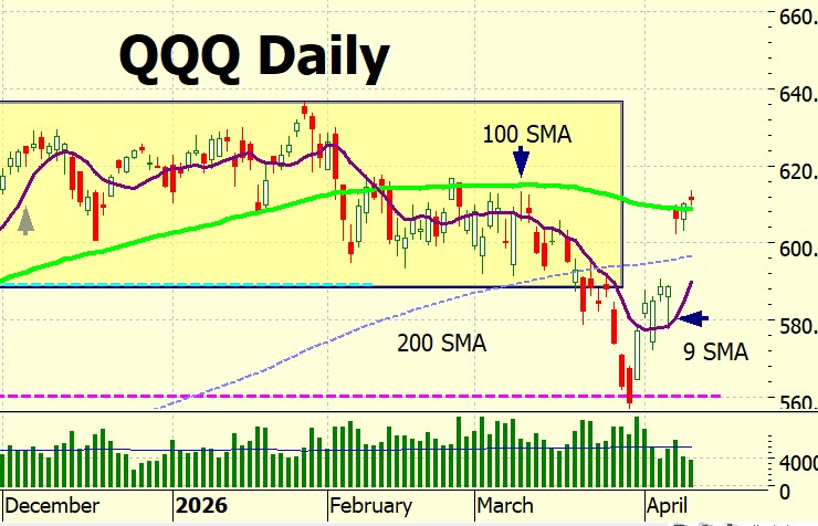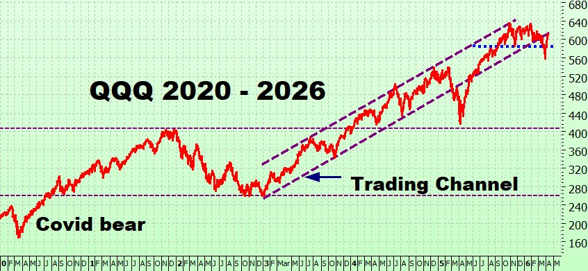 On the long term chart, we see QQQ back at the lower bound of the trading channel.