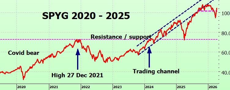 SPYG has rebounded. We don’t take any notice of the volumes on SPYG as it is much less traded than SPY, but the lack of volume in SPY means that the rebound is on shaky ground.