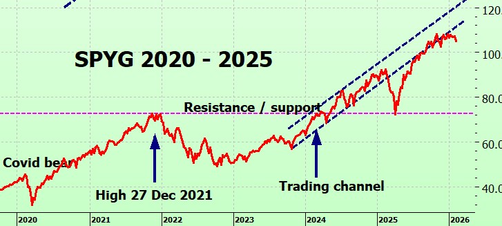 Like SPY, SPYG is stuck in a sideways trading range.