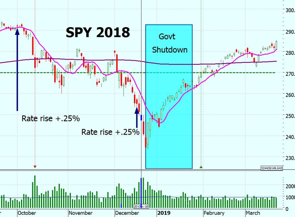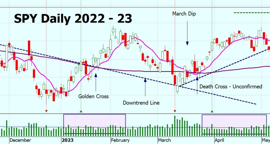 This was an interesting time. Our golden cross came in January and the market went up on lower than average volume. The rise was short lived, however, dropping back to a death cross two months later – BUT the death cross did not complete. SPY rose again – and again on lower than average volume.