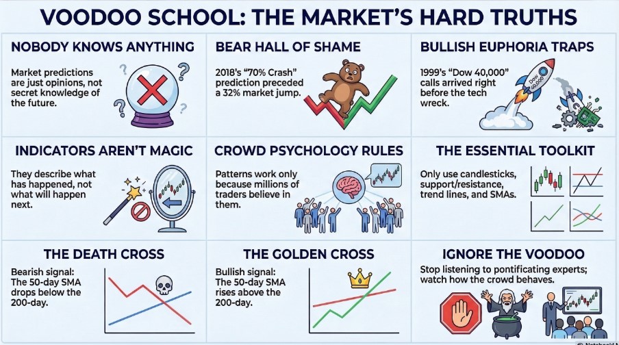 Technical Indicators (“Voodoo”): Mathematical tools and chart overlays—such as stochastics, Bollinger bands, momentum, oscillators, and Fibonacci—used by traders to analyze price movements. The author refers to these as “voodoo” because they only work some of the time and cannot reliably predict the future. However, they remain important because millions of traders believe in them and base their buy/sell decisions on them, creating a self-fulfilling loop.