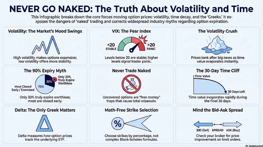 The Greeks (Delta, Gamma, Theta, Vega, Rho): Intimidating jargon traders use to try and impress you. They are just five ways of measuring what pushes an option’s price around. You don’t need to know them to trade successfully.