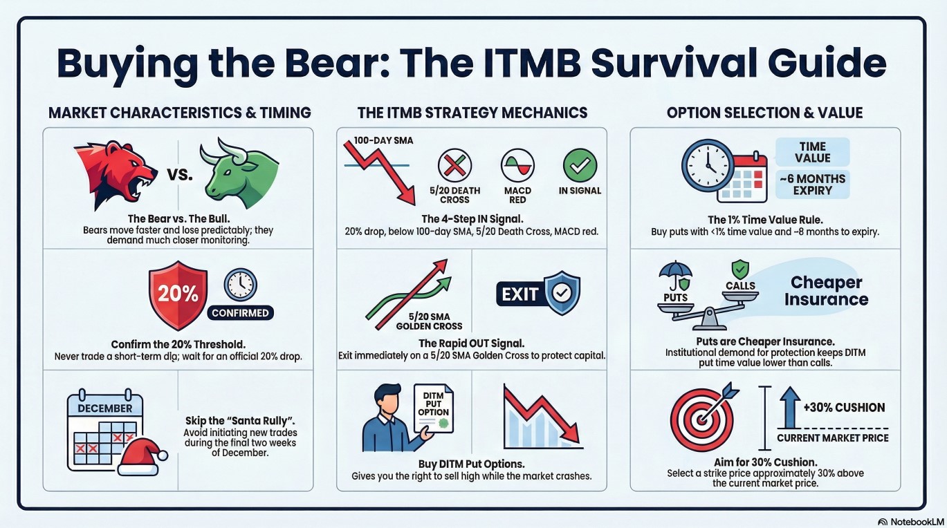 ITMB IN Signal: Your green light to enter a bear trade. It requires four strict criteria: SPY is officially in a 20% bear market, SPY is below the 100-day SMA, a 5/20 SMA death cross hits, and the MACD histogram is red. No gut calls.