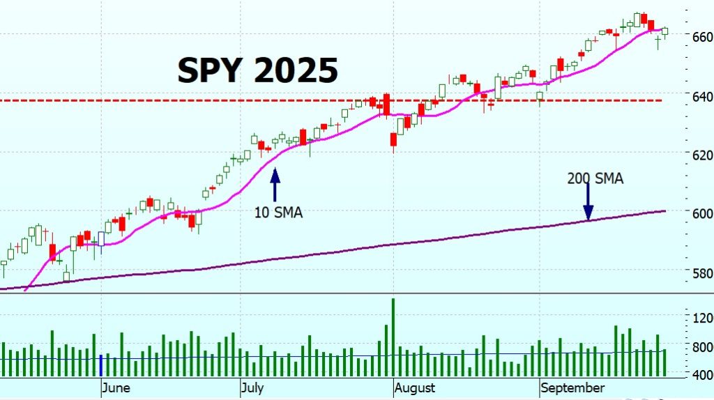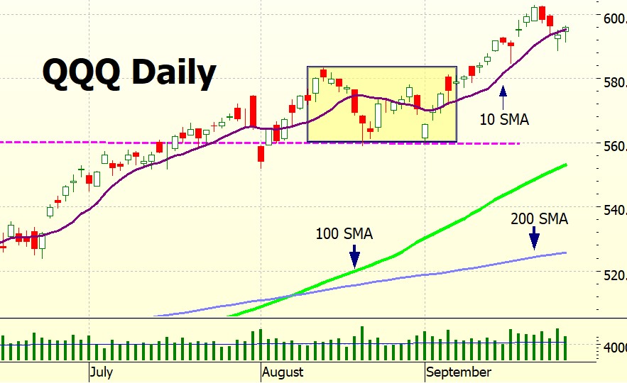SPY made a new high on Monday, then took a bit of a breather for the rest of the week. The doji on Thursday was on high volume, signaling that traders didn’t want it to go down any further, and Friday got back up over the 660 level. It would be perfectly normal behavior for it to consolidate (go sideways) for a while rather than move higher – at least until the shut down situation is resolved.