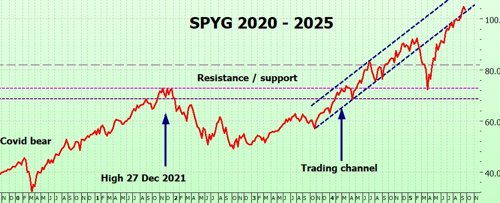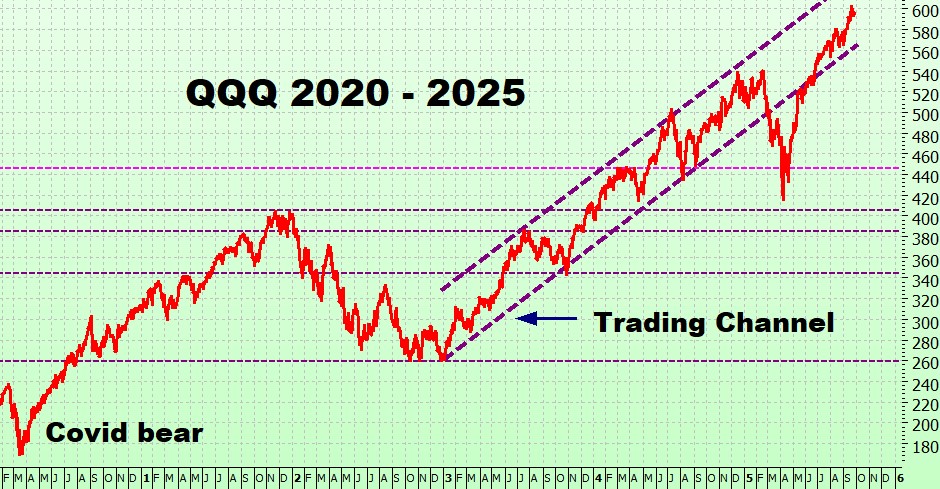 On the long term chart we can see that QQQ is now firmly back in its trading channel. As a point of interest – look how small the Covid bear was, although at the time it was huge. The bear we had earlier this year looks bigger (the Tariff Bear?), but of course that is because we are not using a logarithmic chart (thought – maybe I should do next week’s blog on log charts – any thoughts?) We see how quickly they were both over when comparing them to the Biden bear which dragged on for over a year. Gruelling.