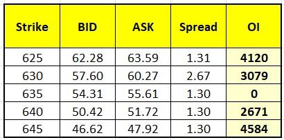 But that doesn’t answer the question: does OI affect the spread? Let’s look at the strikes 625 – 645 and the open interest.
