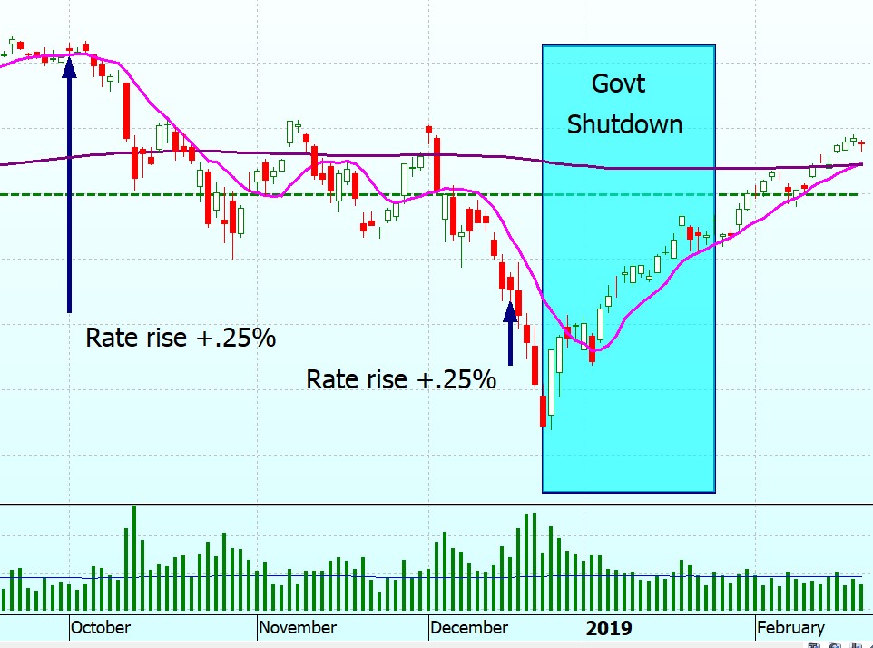 The last partial shutdown was 35 days, Dec 22, 2018 – Jan 25, 2019, and it came just after 2 interest rate rises. The chart shows what happened – the comforting thing was that the market went up during the period of the shut down, so all is not doom and gloom