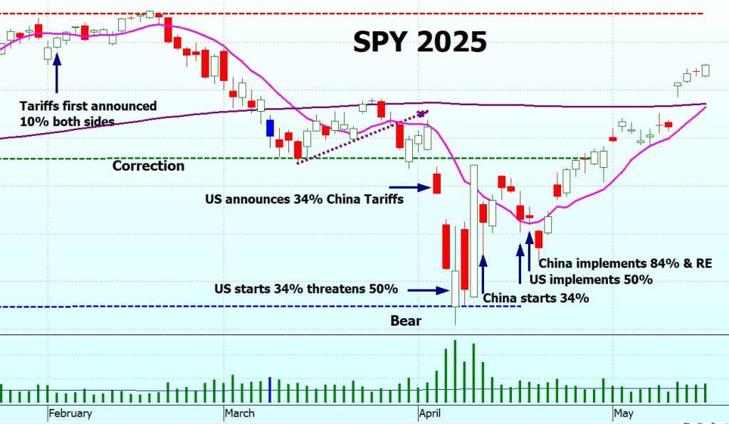 In early February the US and China announced additional 10% tariffs on each other. Initially the market was unaffected but by late February had started to slide. It hit the correction level and bounced, for no particular reason that I can work out. The bounce was short lived, and it continued sideways for almost a month. Then on 3 April the new 34% tariffs on China were announced, and SPY went into correction territory, dropping even further the next day.
