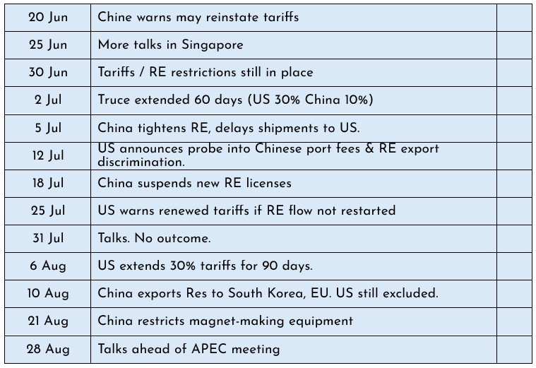 The 9 October China expanded RE controls and added more REs. Exporters (including foreign firms) must get Chinese Govt license to export product whose value derived from Chinese-source rare earths exceeds 0.1 %. The rules  cover technology tied to RE mining, processing, magnet manufacturing, recycling, etc. Exports for military use will be denied, and those in advanced semiconductor / AI applications will be assessed on a case-by-case basis. Companies with both civilian and military businesses may be denied access to REs even for civilian purposes, e.g. Boeing. Possibly laptops and smartphones will not exceed the threshold, but motors will exceed it.